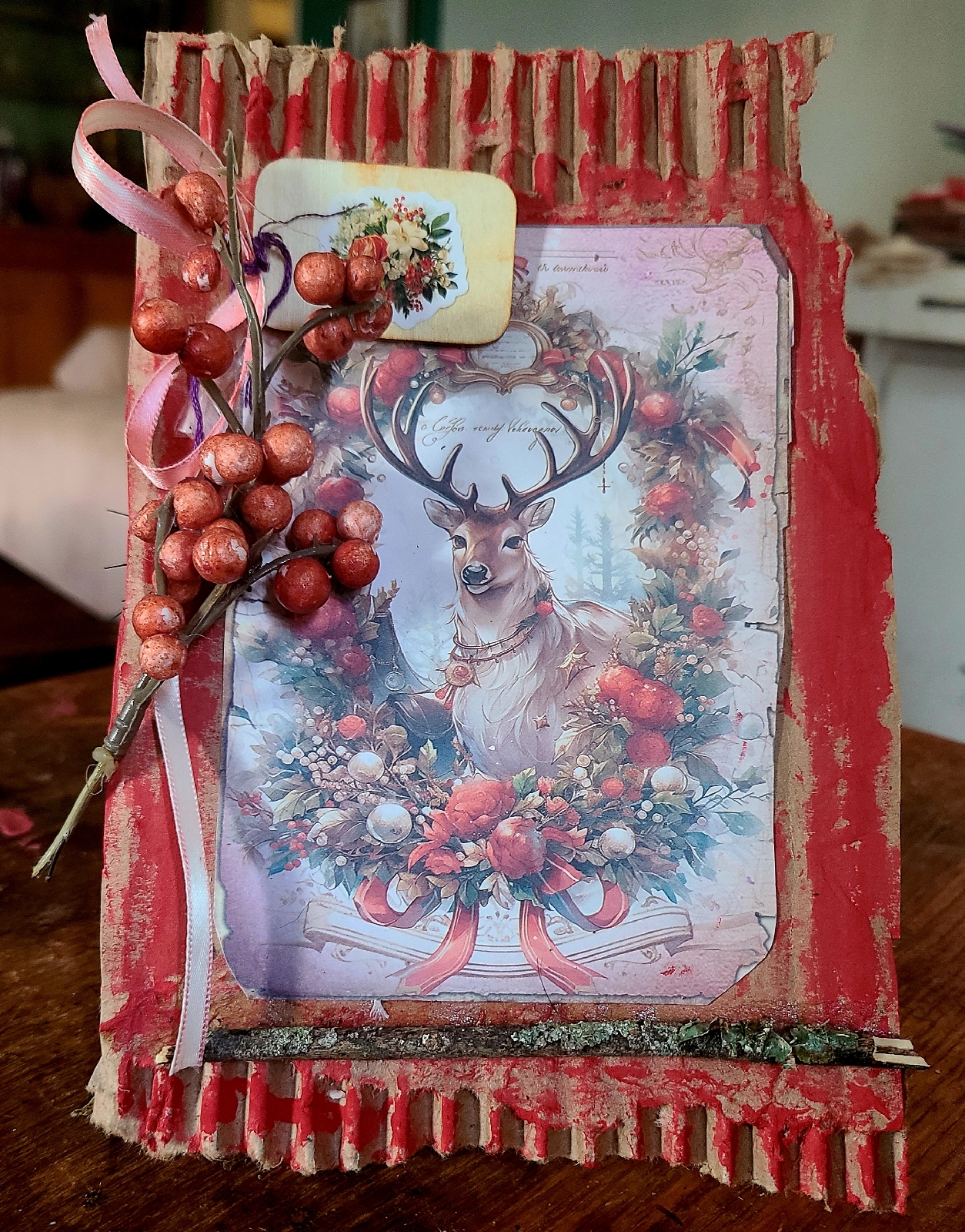 I love using found objects to craft with. Cardboard base, dry berries,sticks and deer print from Temu.
