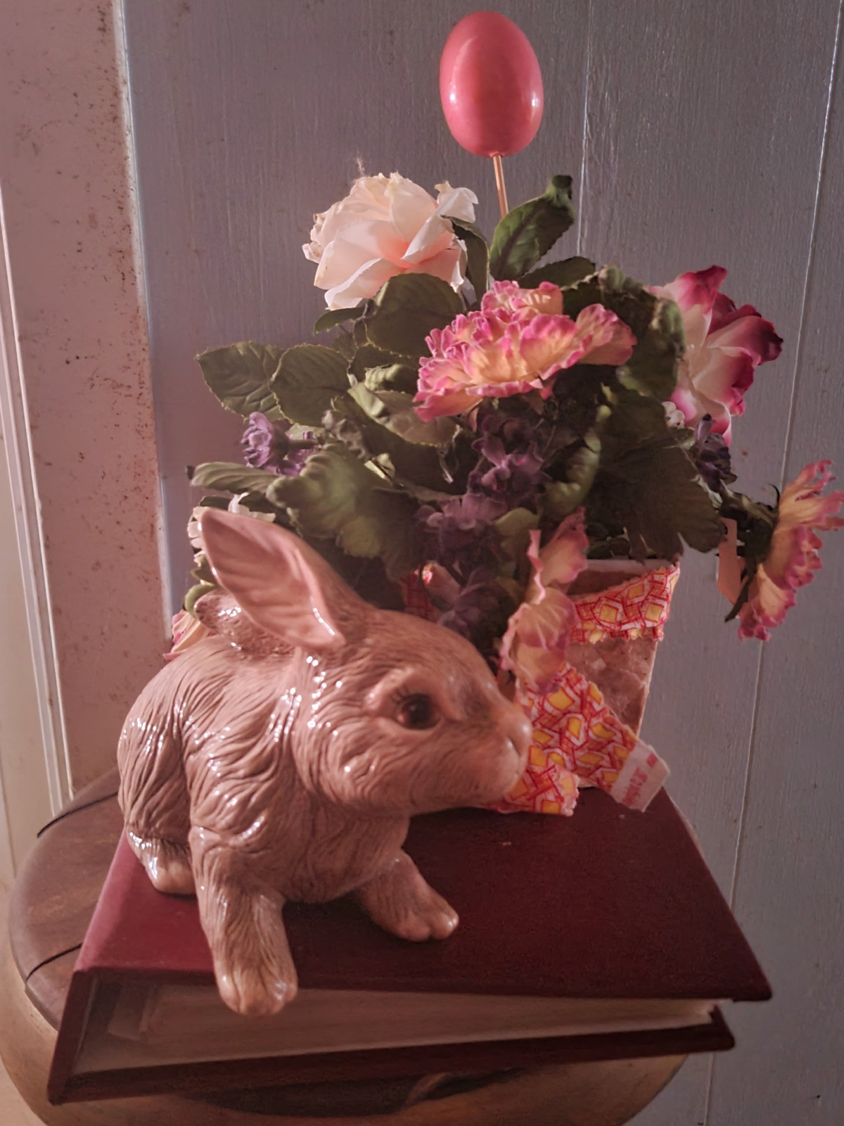 My basket of ceramic eggs is made from an old gift box that I covered in coffee stained torn coffee filters. Then torn in strips and glued on to look like a woven basket. Tied with fabric bow. Filled it with grass and eggs and a cute rabbit.